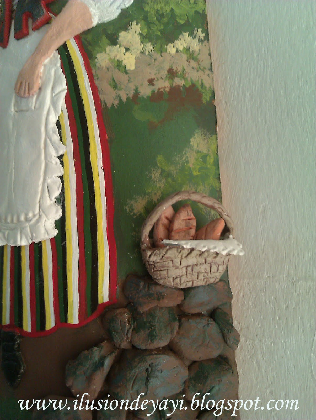 Su futuro dueño quería a la "maga" (así es cómo se les llama aquí) con una cesta. Yo no sabía ni dónde ponérsela, y al final, la puse en una esquinita, le hice un pañito y tres panes con pasta, y la apoyé en unas piedras hechas también con pasta: