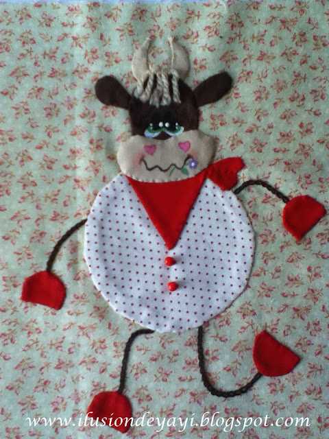 Le hice algún pequeño cambio ya que quería que parecieran más "country", así que les hice la cara pintada con pintura especial para tela, les hice ese flequillo que llevan las vacas(que no sé cómo se llama)..etc. Y esto es lo que salió: