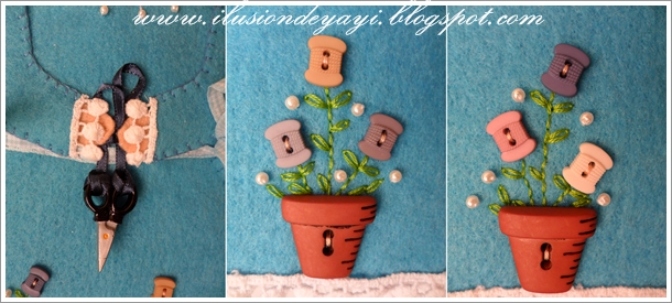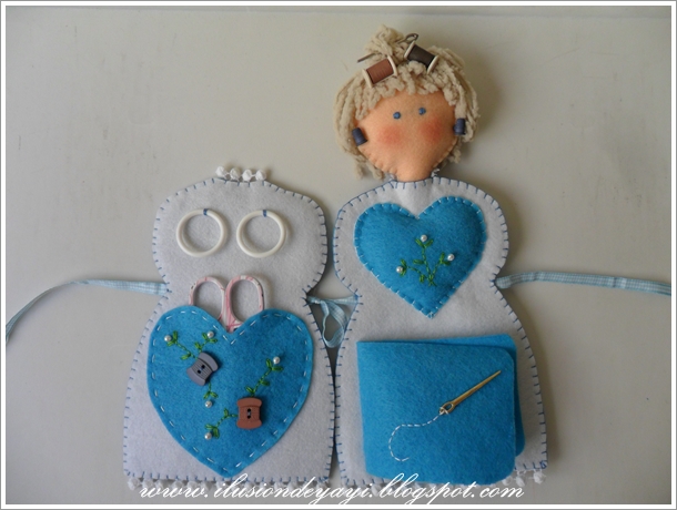 4 - Y al otro blanco, le cosemos un corazón ya decorado, lo rellenamos un poquito (para pinchar alfileres) y debajo cosemos dos láminas de fieltro (para las agujas)